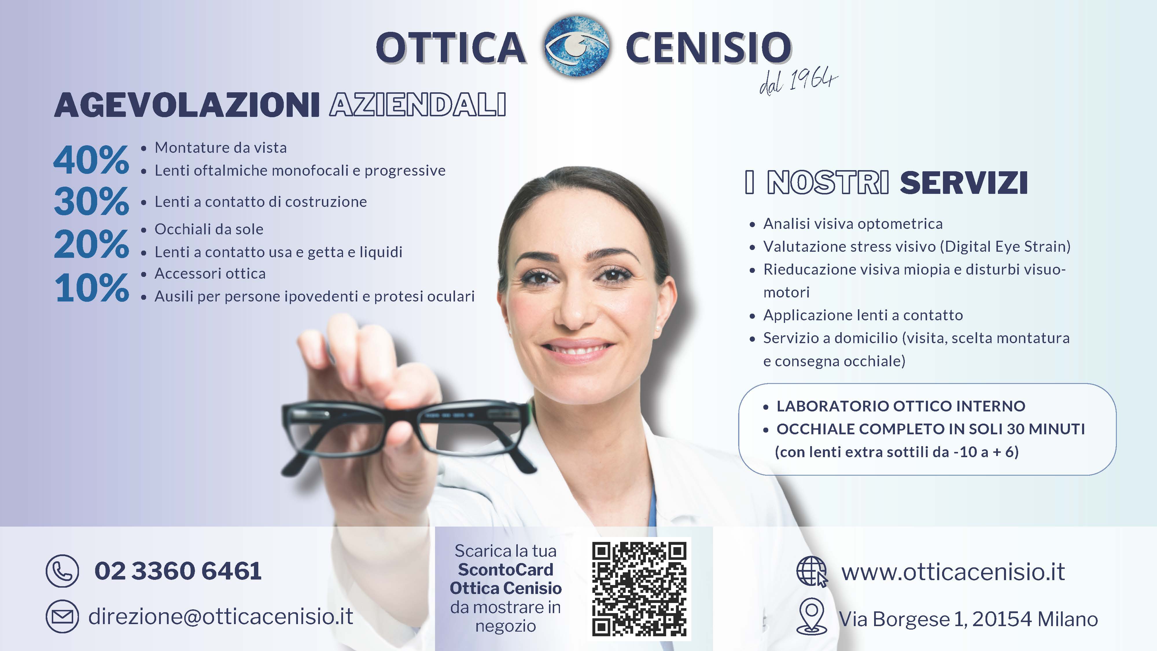 OTTICA - OPTOMETRIA - CONTATTOLOGIA Sconto applicato ai soci ed ai loro familiari: Occhiali da vista 25% - Occhiali sole 20% - Lenti a contatto e liquidi di manutenzione 10%.